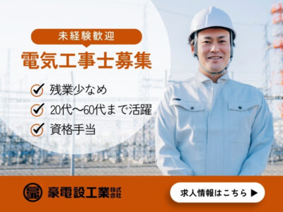 豪電設工業株式会社は、宮城県仙台市を拠点に建物の電気設備工事を行う会社です。設立から数年の若い会社ですが、多くの方々の支えにより成長を続けています。私たちは、従業員一人ひとりが安心して働ける環境を整え、会社の発展とともに従業員の成長も大切にする企業を目指しています。常により良い未来を考え、行動し続けることで、会社も従業員もともに成長できる職場を築いていきます。詳細は会社概要ページにまとめておりますので是非ご覧ください。